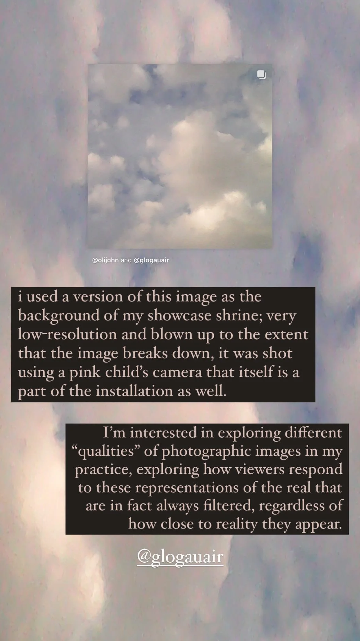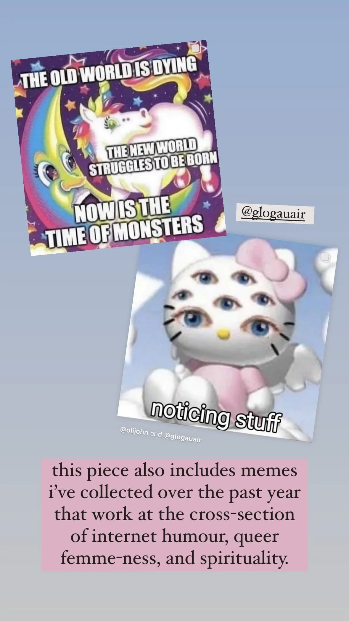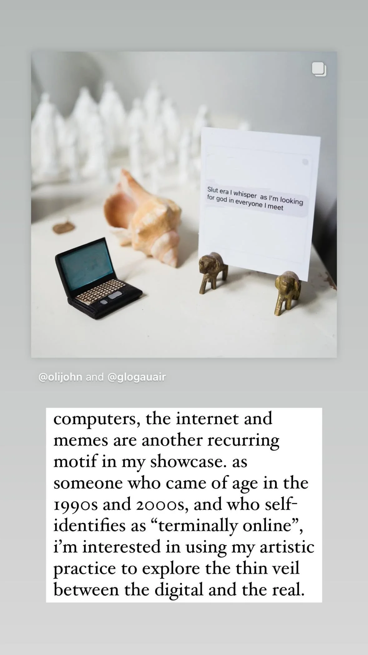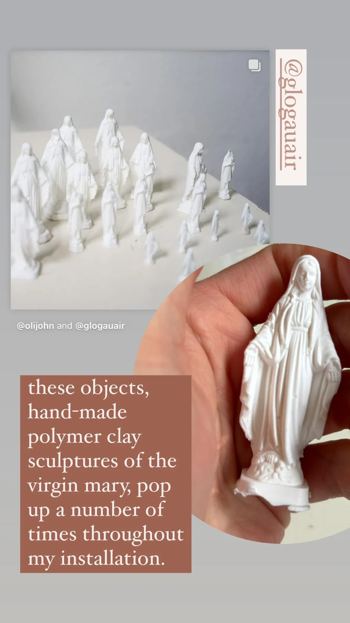 In there are cathedrals everywhere for those with the eyes to see, Johnston has created a shrine to life as a queer, femme, chronically ill and “terminally online” woman. Using objects sourced from her explorations around Berlin since early April, objects brought from home, images created at glogauAIR and years ago, printed memes, and hand-made polymer clay figurines of the virgin mary, the artist explores questions around gender, femininity, sexuality, the internet, the body, identity, trauma, grief, iconography and more. - curator Suzy Royal