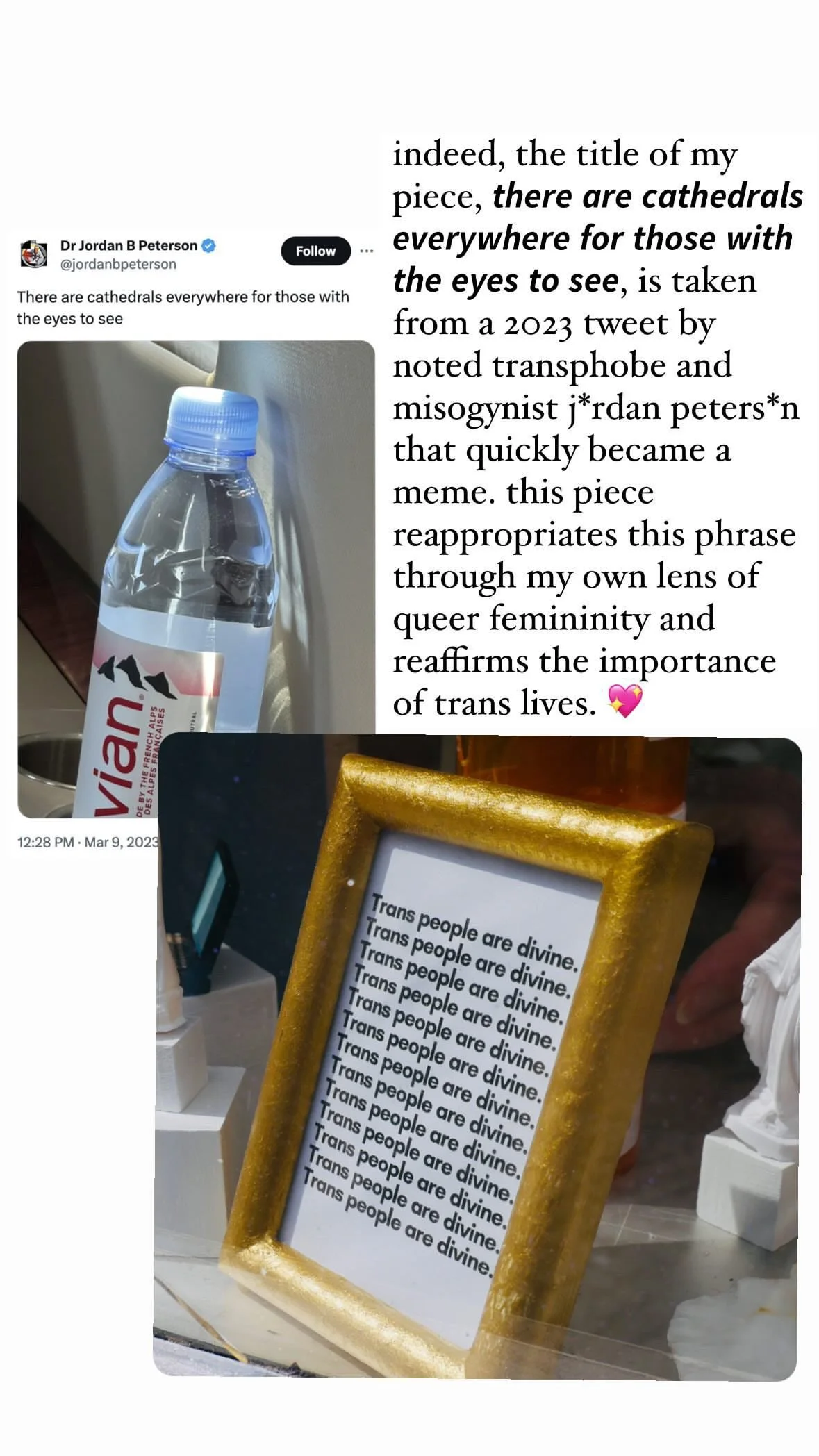 Pigment ink prints; foam core; wood; cardboard; pill bottles; polymer clay; printed and framed memes; dired and fresh flowers; found objects.