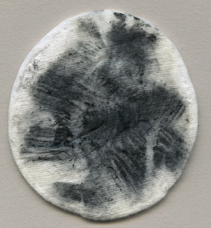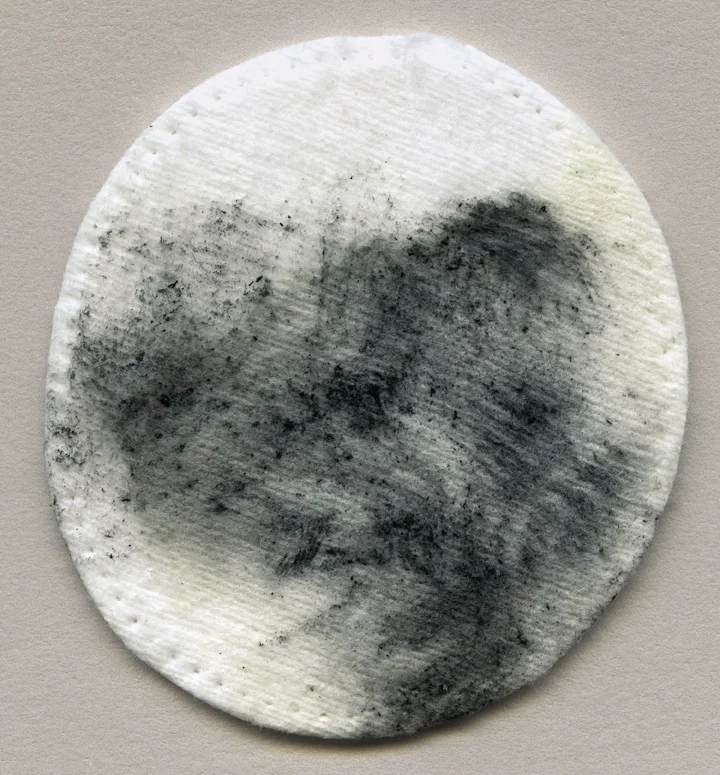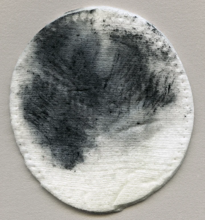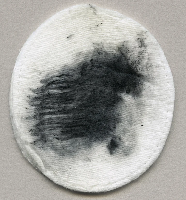 These works can be described as an examination of the concept of the self-portrait, traditionally considered to be a representation of the artist's body or face. Here, each object records “a day in the life”, whereby makeup worn during the day is wiped clean at the conclusion of the day. Not immediately recognizable, the objects are visually fascinating, each with its actual real-world use etched upon its face. These images can stand in as a daily self-portrait of the artist, collected day after day, a record of time and an embodiment of one's own personal history. The body is preserved in the image, in the presence of eyelashes here and there; in this way, the piece begins to take on elements of a religious relic, a kind of “shroud of turin” of the artist. Questions of femininity and beauty are also raised here, as the initially abstract images take on a different meaning once it is understood that they represent garbage, but a garbage whose business has been that of beauty.
