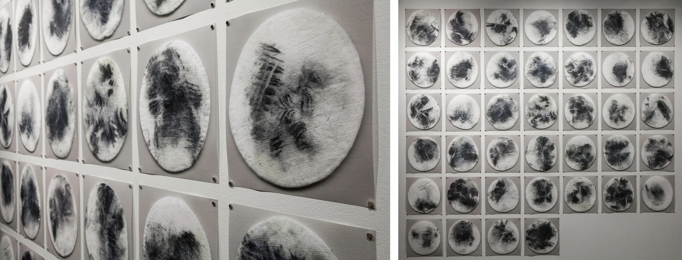 These works comprise an installation entitled Detritus (cosmetic pads), which was displayed at Karsh-Masson gallery as a part of the exhibition SELFIE (March 17 - April 19) in 2015, and which was acquired by the City of Ottawa in 2016.